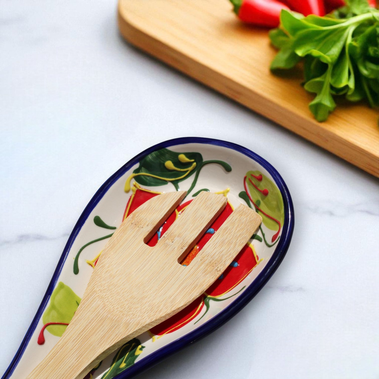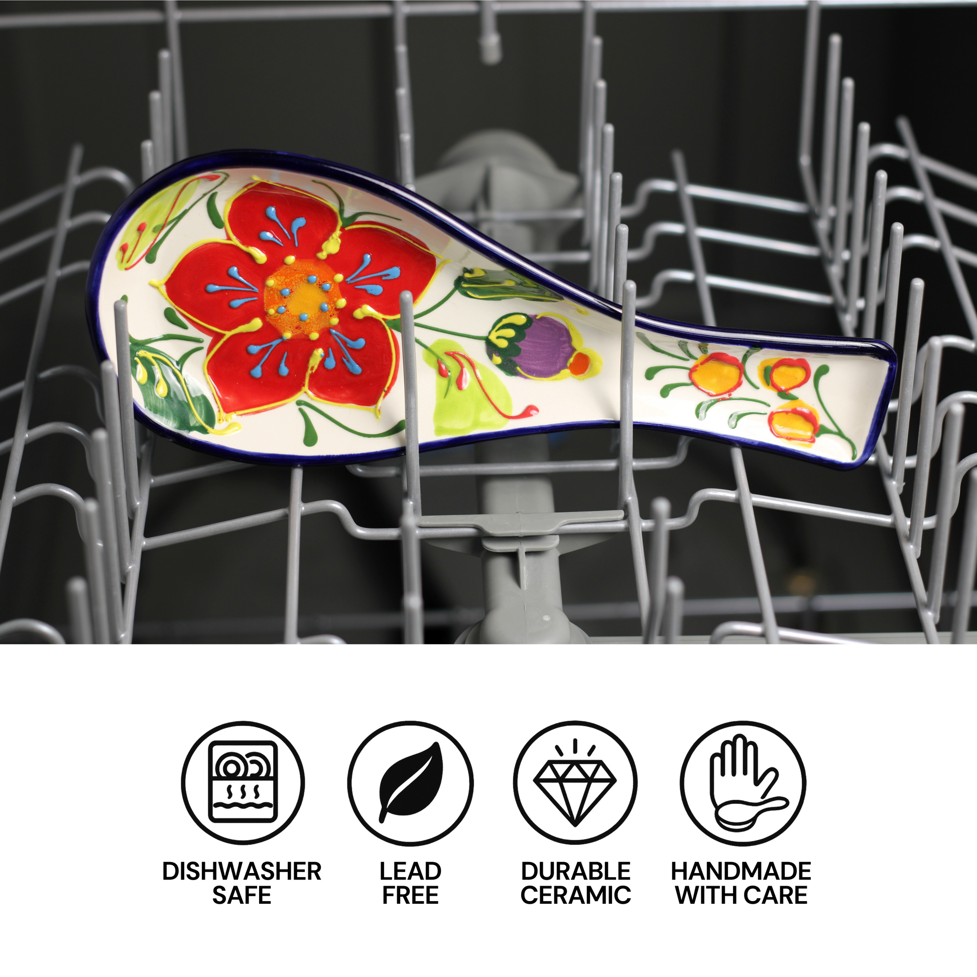 Playful petals and color-blocked accents make Aventura Ceramic Spoon Rest a joyful statement piece that keeps messes contained.