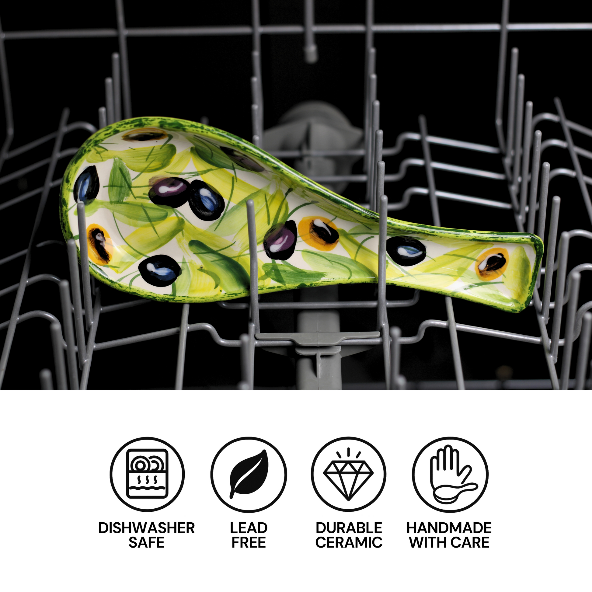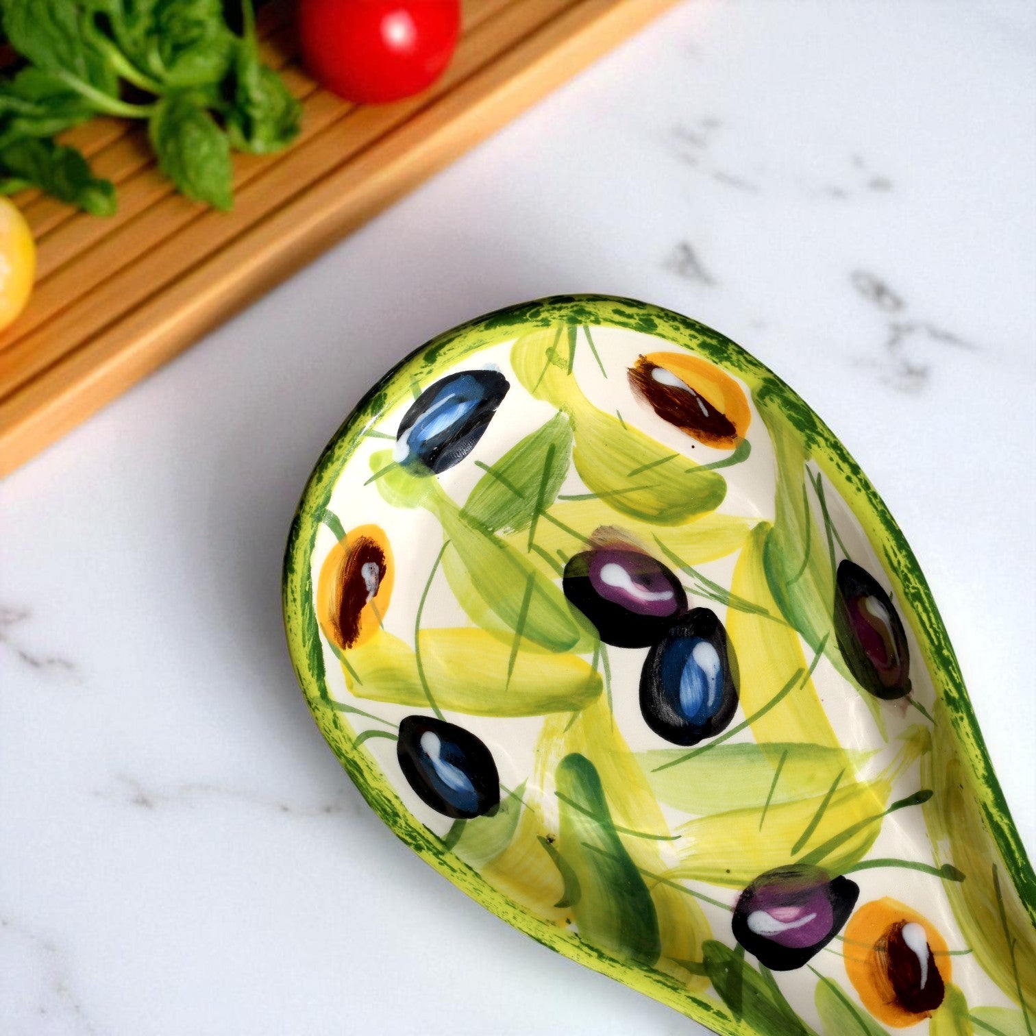 Bring the warmth of Spain to your countertop with our Olive Hand-Painted Ceramic Spoon Rest. Handmade by artisans, this piece blends functionality with rustic elegance.